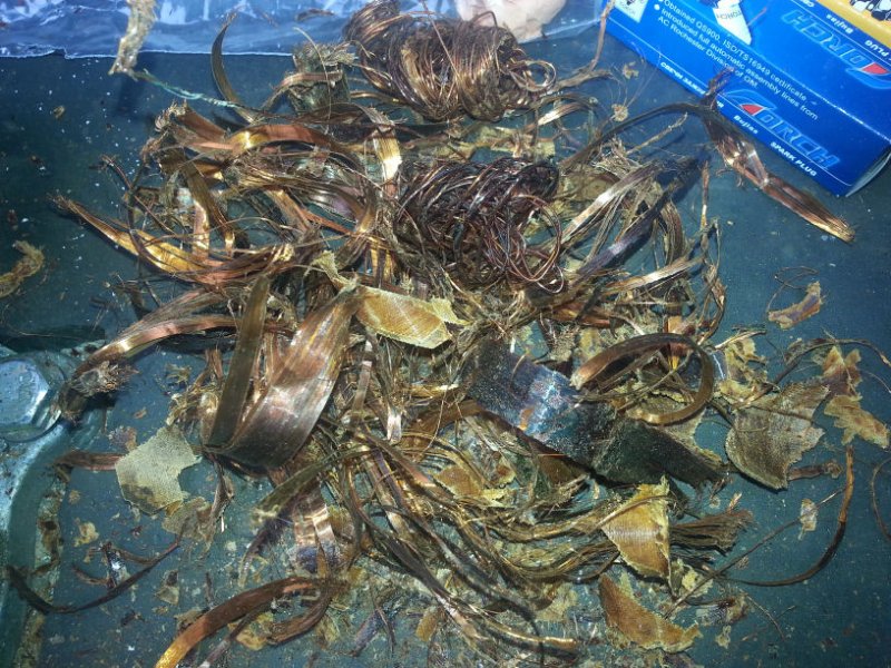 La seconde solution consiste à "opérer" la bobine (HT) existante. Cette bobine possède deux enroulements de fils : un premier (extérieur) de fil de 0,04 mm qui génère la (HT), un second, séparé par un isolant, composé d'un fil de 0,6 mm qui crée la (BT). A l'aide d'un cutter, il s'agit d'ôter tout les spires de fils de cuivre et de le remplacer par 361 spires soit ~20 mètres de fil cuivre émaillé de 0,9 mm.