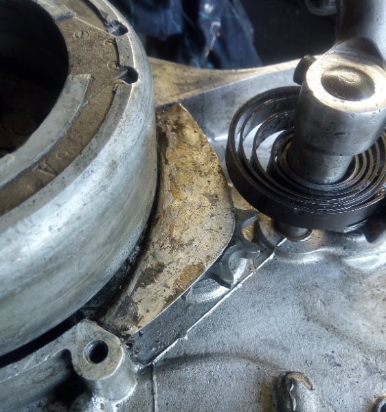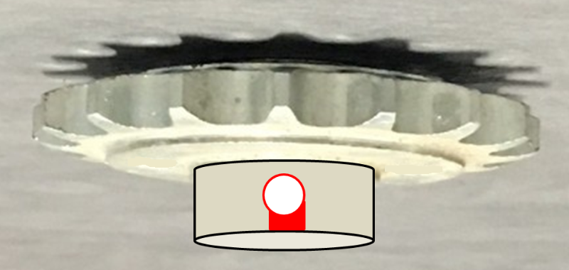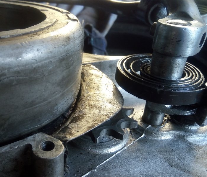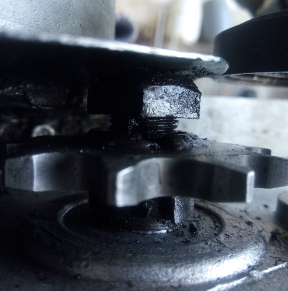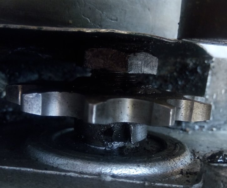 J'en conclus qu'il ne me sert donc pas à grand-chose de vouloir à tout prix enlever ma petite-tôle-surprise-customisation-cadeau-pas-prévue, puisque vue l'épaisseur du pignon et de son excroissance cylindrique inférieure, je ne pourrai de toute façon pas le faire sortir sans déposer le volant (ça a l'air déjà juste en temps normal avec un pignon "tout plat", alors là...).