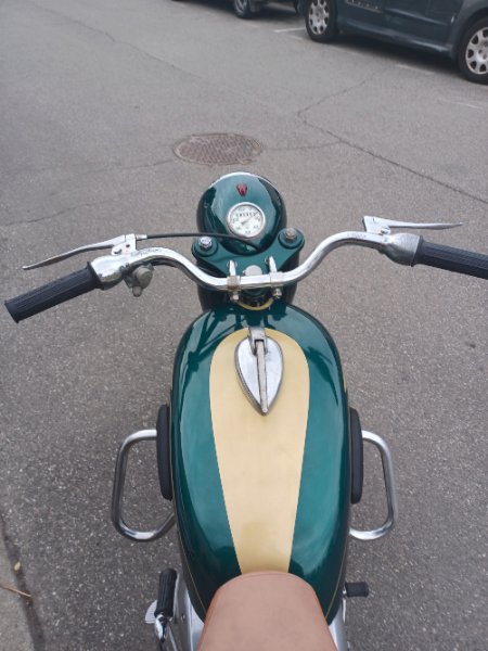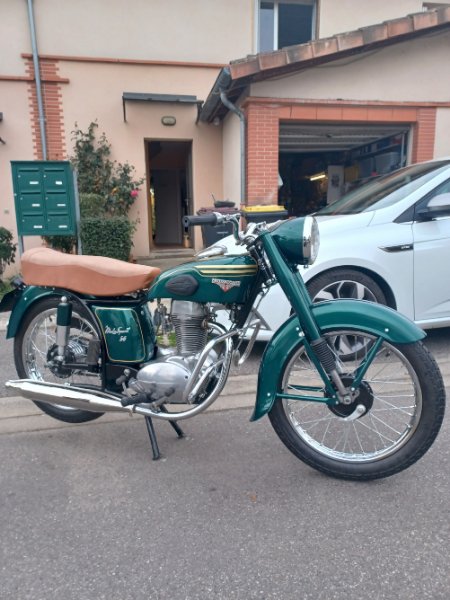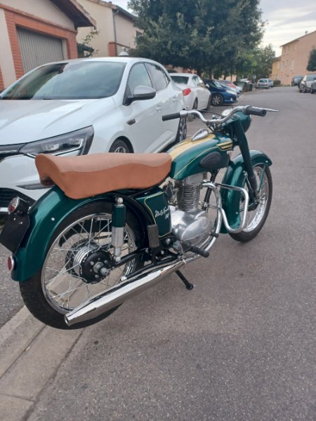 Les années ont passées et le projet suspend car j'avais toujours des mobs à refaire pour des potes ou moi même. Au début de l'été j'ai repris le chantier car ayant rencontré deux personnes qui sont devenus mes copains avaient eux aussi un chantier similaire. Du coup ça m'a motivé. Pour ce qui est du moteur, j'ai changé les segments,et j'ai tout bien nettoyé. La bobine d'allumage à été refaite car un fil s'était cassé. j'ai mis un condensateur électronique,seul les rupteurs sont d'origine. j'ai repeints la moto entièrement car la couleur ne plaisait pas à madame. Le cadre en noir et le reste en vert foncé. Les bandes sur les réservoir sont de couleurs or car je me suis renseigné pour un chromage du réservoir,pare jambe et cerclage de phare mais c'était trop cher! Pour ce qui est du carburateur Gurtner,je l'ai passé aux ultrasons. Ça y est la moto est maintenant terminée et voici quelques photos. Les adeptes de l'origine risque de ne pas aimer mais après tout ce n'est que de la peinture!