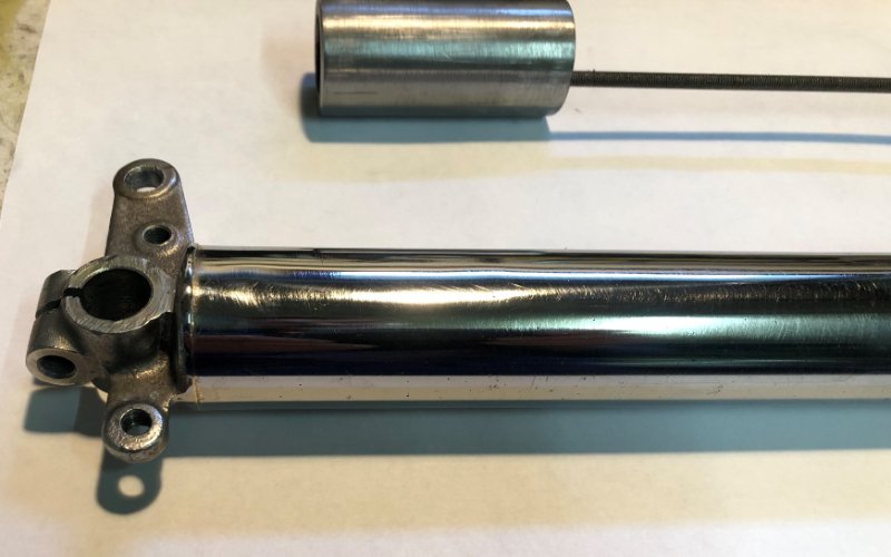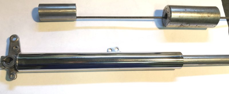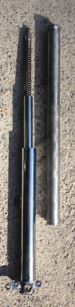 Le bras droit de la fourche était enfoncé sur 70 mm en partant du bas.A l'aide d'un cylindre creux Ø 35,9 mm extérieur,Ø 24 mm intérieur poussé jusqu'à l'enfoncement et quelques petits coups de marteau le bras est réparé .Ensuite polissage et vernis 2 ou 3 couches.
