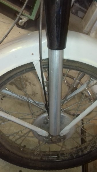 je vais changer la fourche car les 2 parties coulissantes rep 406.604 sont faussées: flèche 5 mm sans doute due à un choc de la roue sur un obstacle. le redressage n'est pas trop la bonne option au niveau sécurité si on peut en trouver une en bon état.