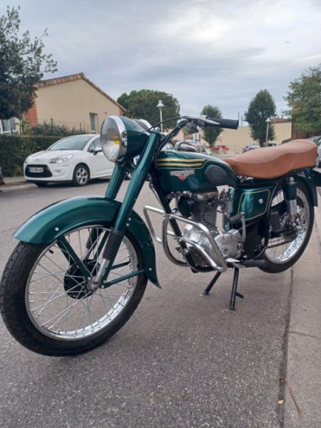Les années ont passées et le projet suspend car j'avais toujours des mobs à refaire pour des potes ou moi même. Au début de l'été j'ai repris le chantier car ayant rencontré deux personnes qui sont devenus mes copains avaient eux aussi un chantier similaire. Du coup ça m'a motivé. Pour ce qui est du moteur, j'ai changé les segments,et j'ai tout bien nettoyé. La bobine d'allumage à été refaite car un fil s'était cassé. j'ai mis un condensateur électronique,seul les rupteurs sont d'origine. j'ai repeints la moto entièrement car la couleur ne plaisait pas à madame. Le cadre en noir et le reste en vert foncé. Les bandes sur les réservoir sont de couleurs or car je me suis renseigné pour un chromage du réservoir,pare jambe et cerclage de phare mais c'était trop cher! Pour ce qui est du carburateur Gurtner,je l'ai passé aux ultrasons. Ça y est la moto est maintenant terminée et voici quelques photos. Les adeptes de l'origine risque de ne pas aimer mais après tout ce n'est que de la peinture!